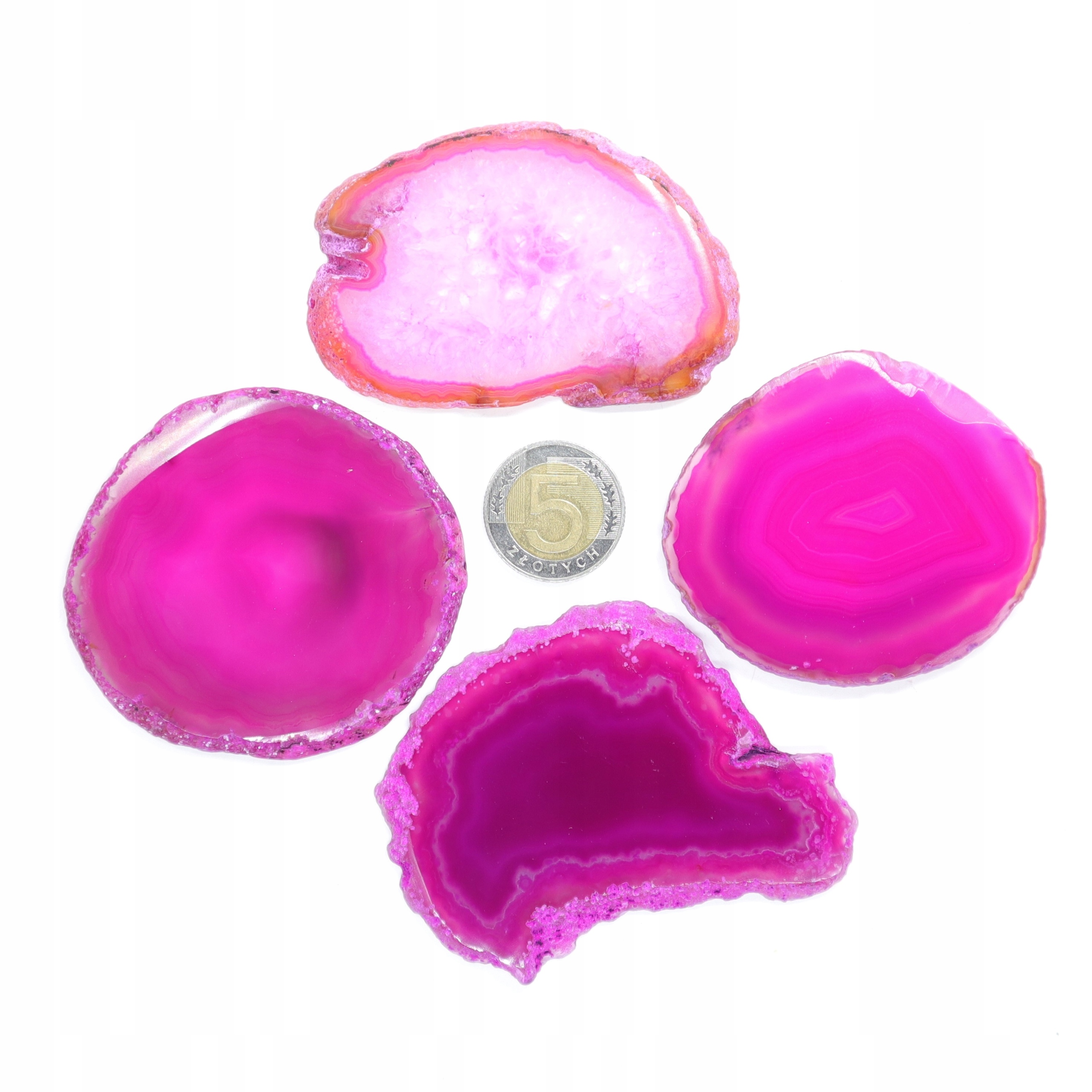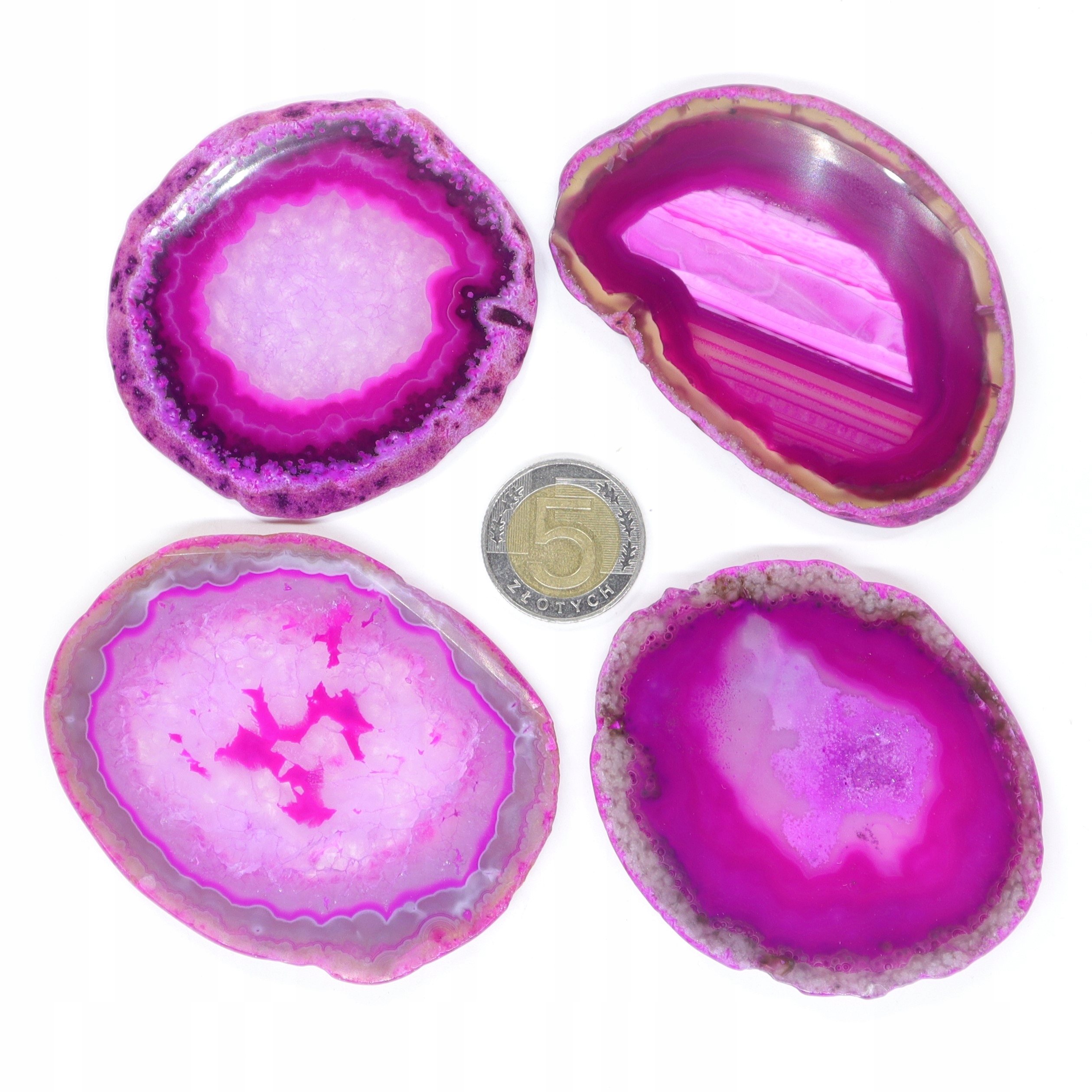 Plastry cięte z naturalnego agatu, polerowane, barwione na różowo. Plastry różnią się odcieniem, wzorem i rozmiarem.