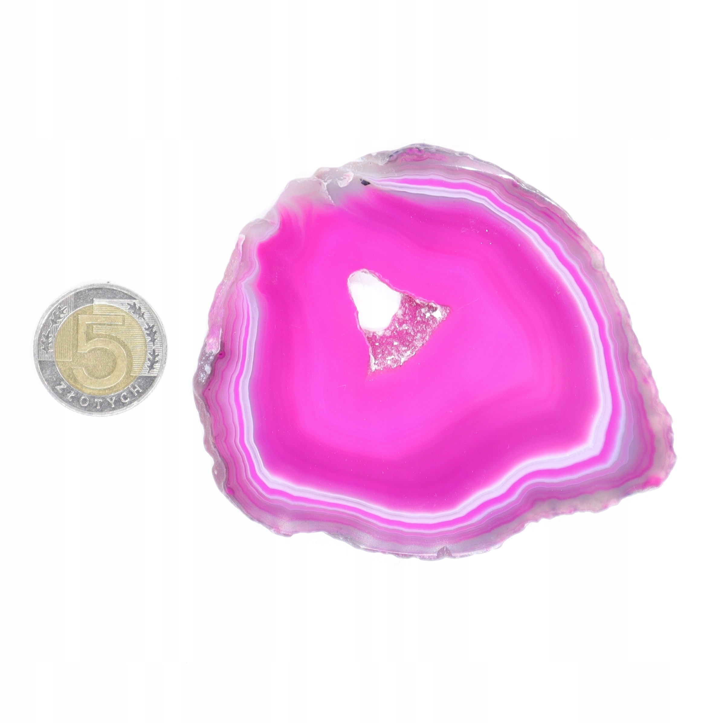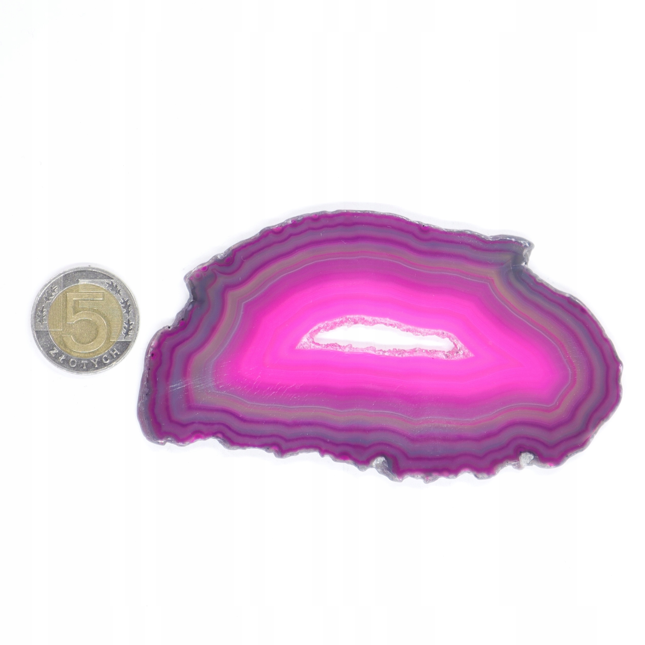 Plastry cięte z naturalnego agatu polerowane barwione na różowo. Plastry różnią się odcieniem, wzorem i rozmiarem.