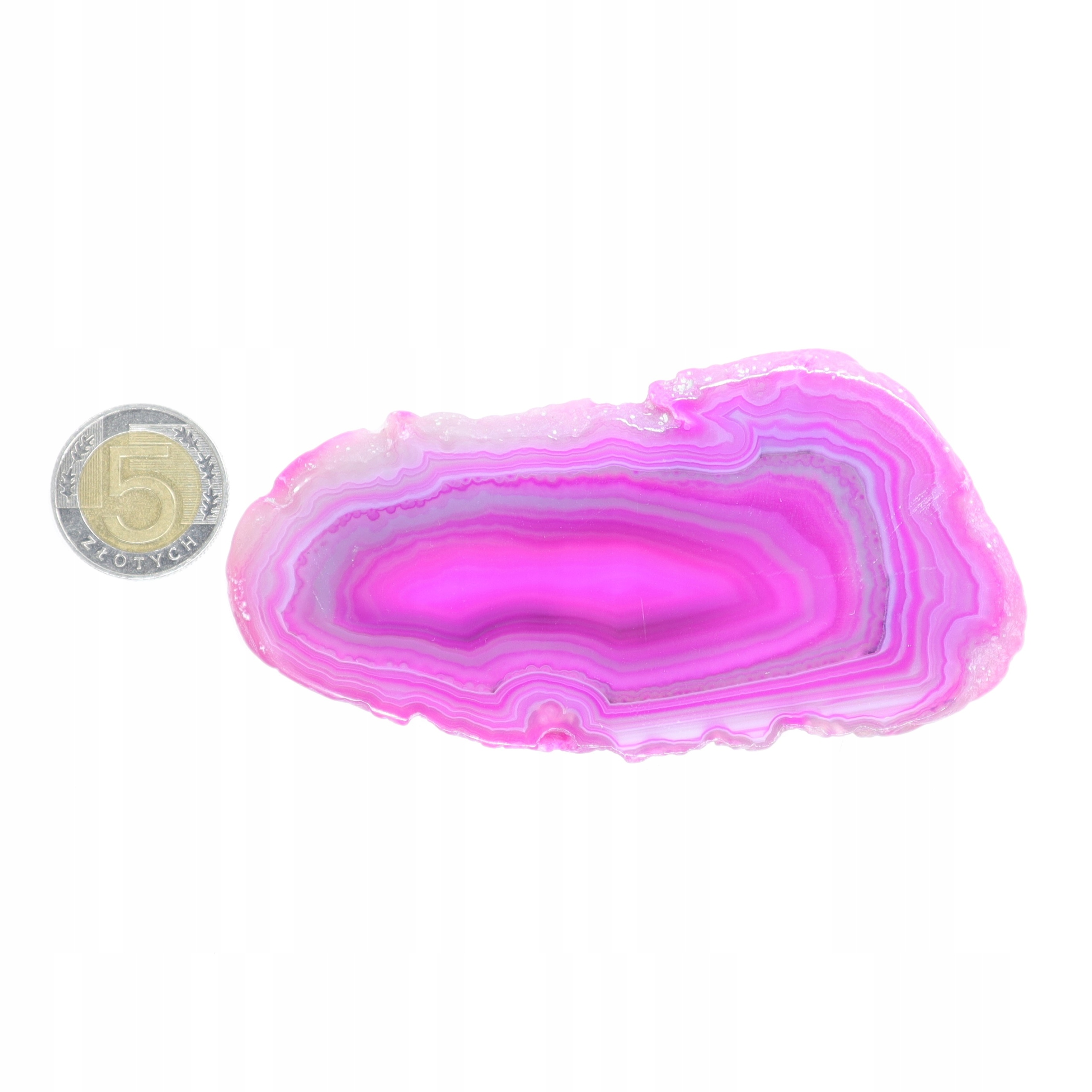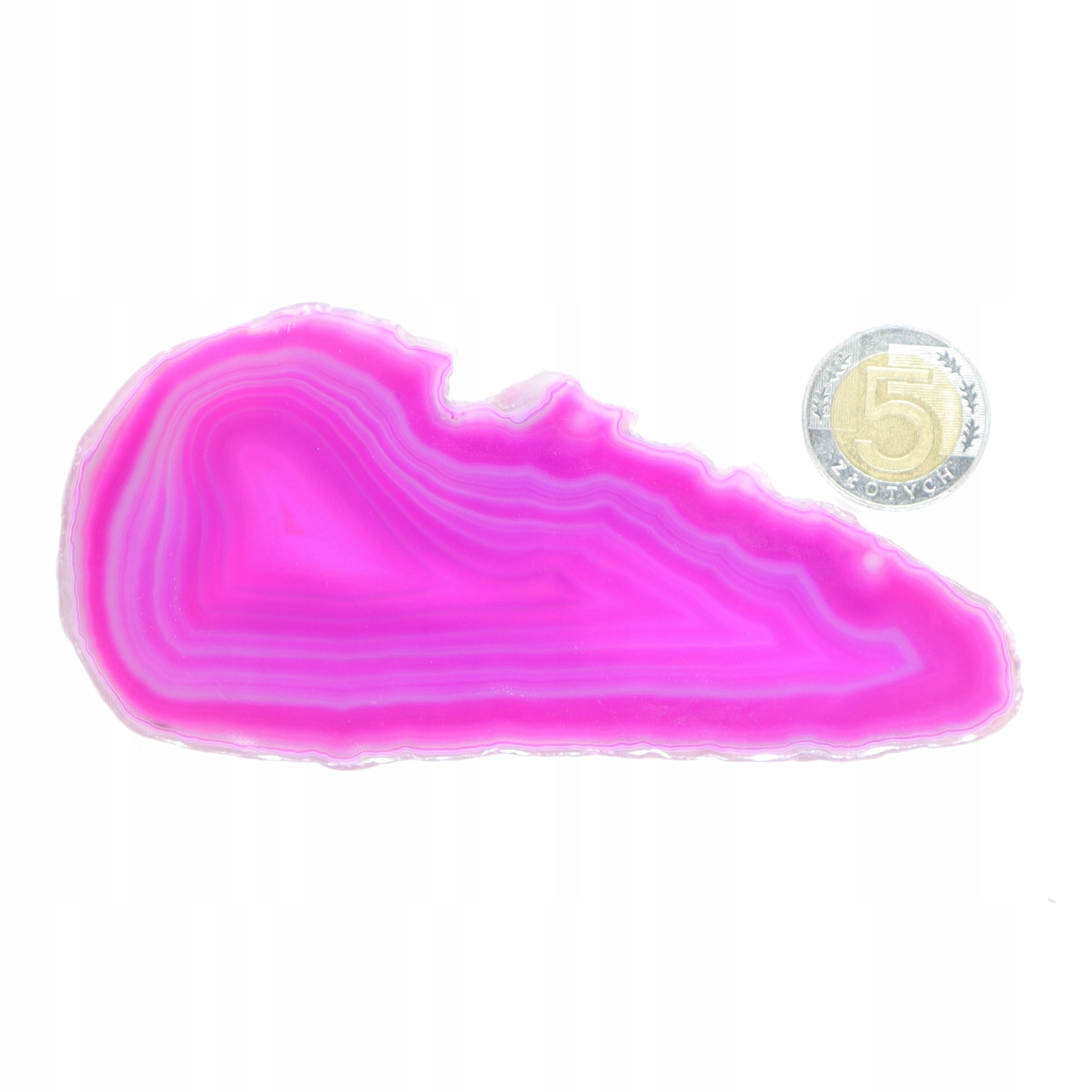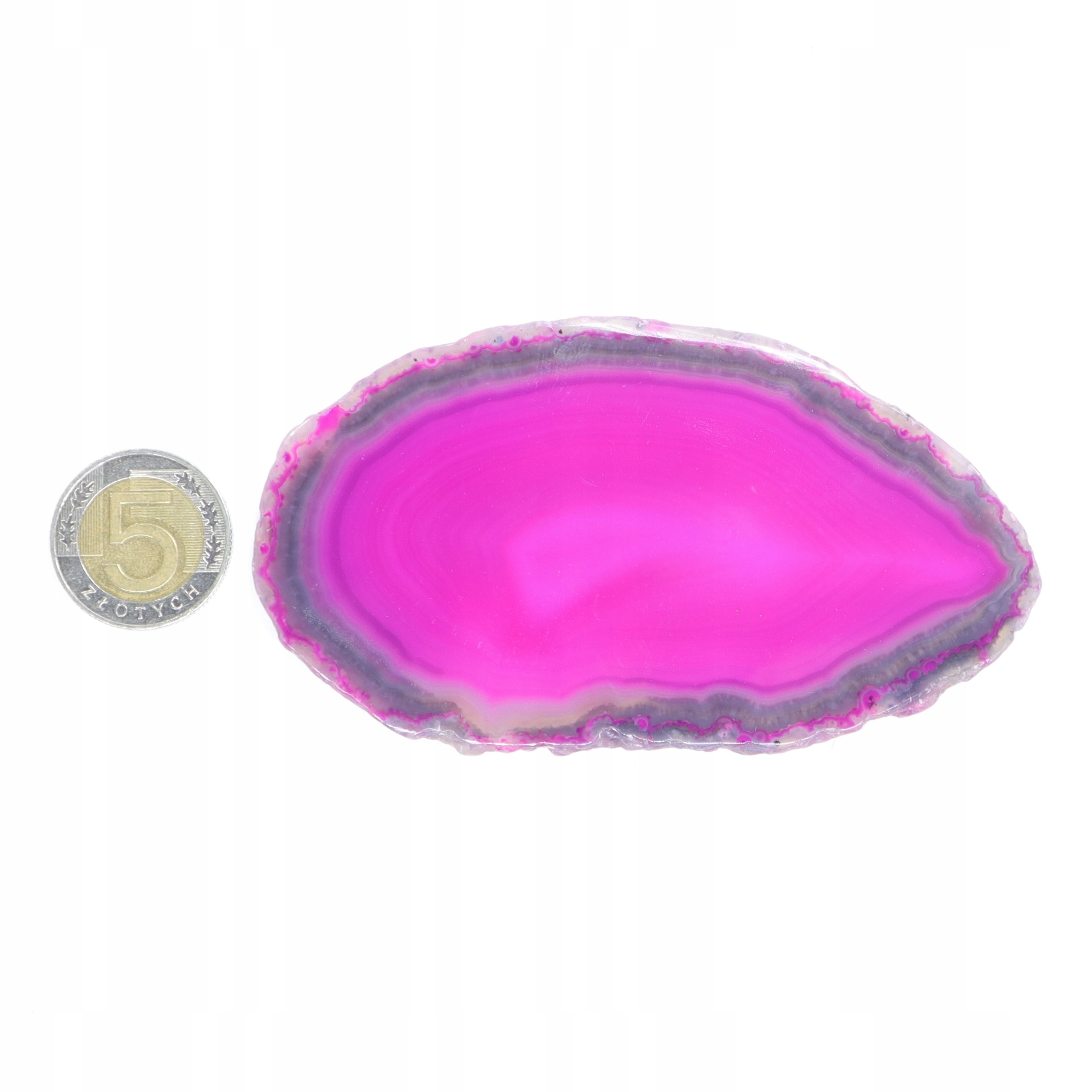 Plastry cięte z naturalnego agatu polerowane barwione na różowo. Plastry różnią się odcieniem, wzorem i rozmiarem.