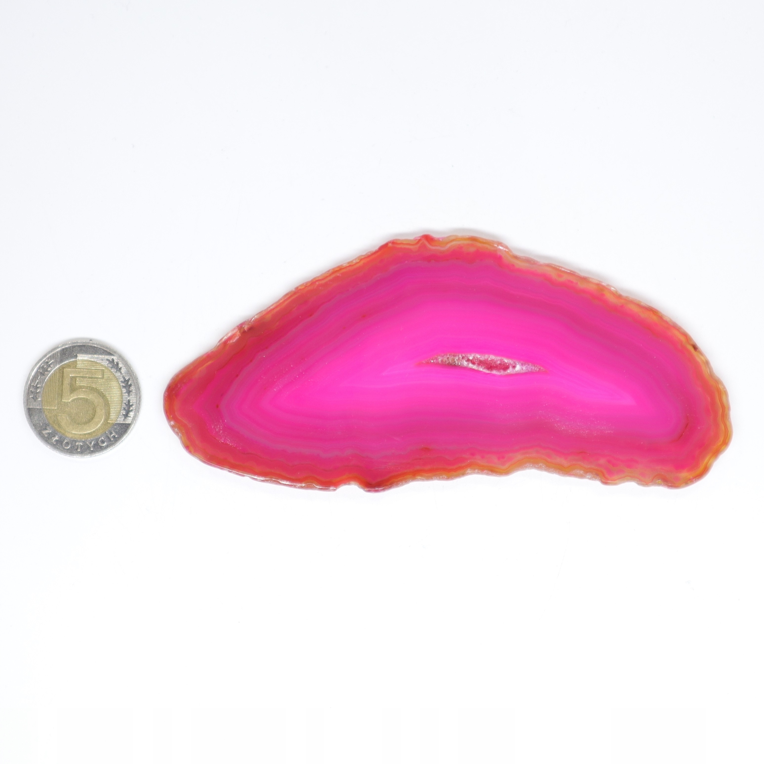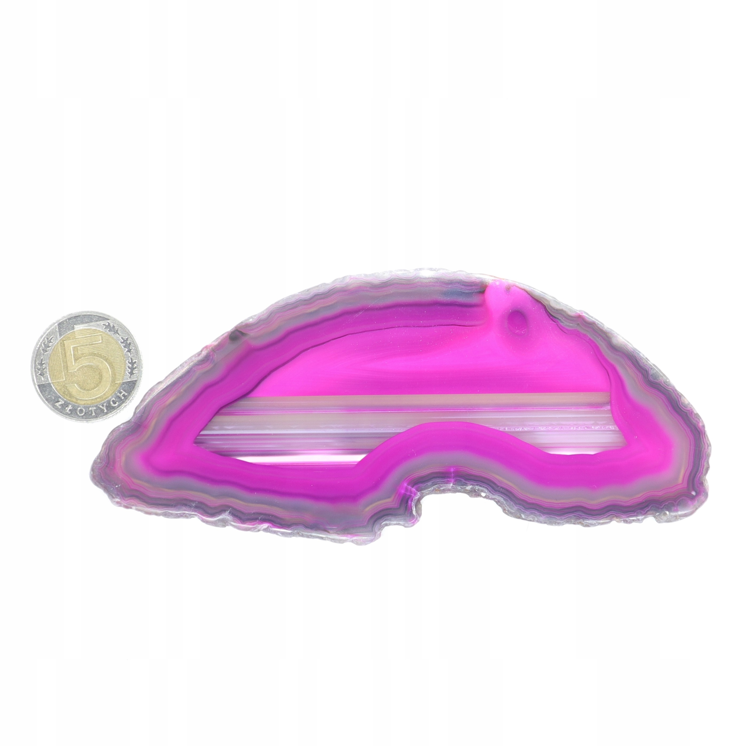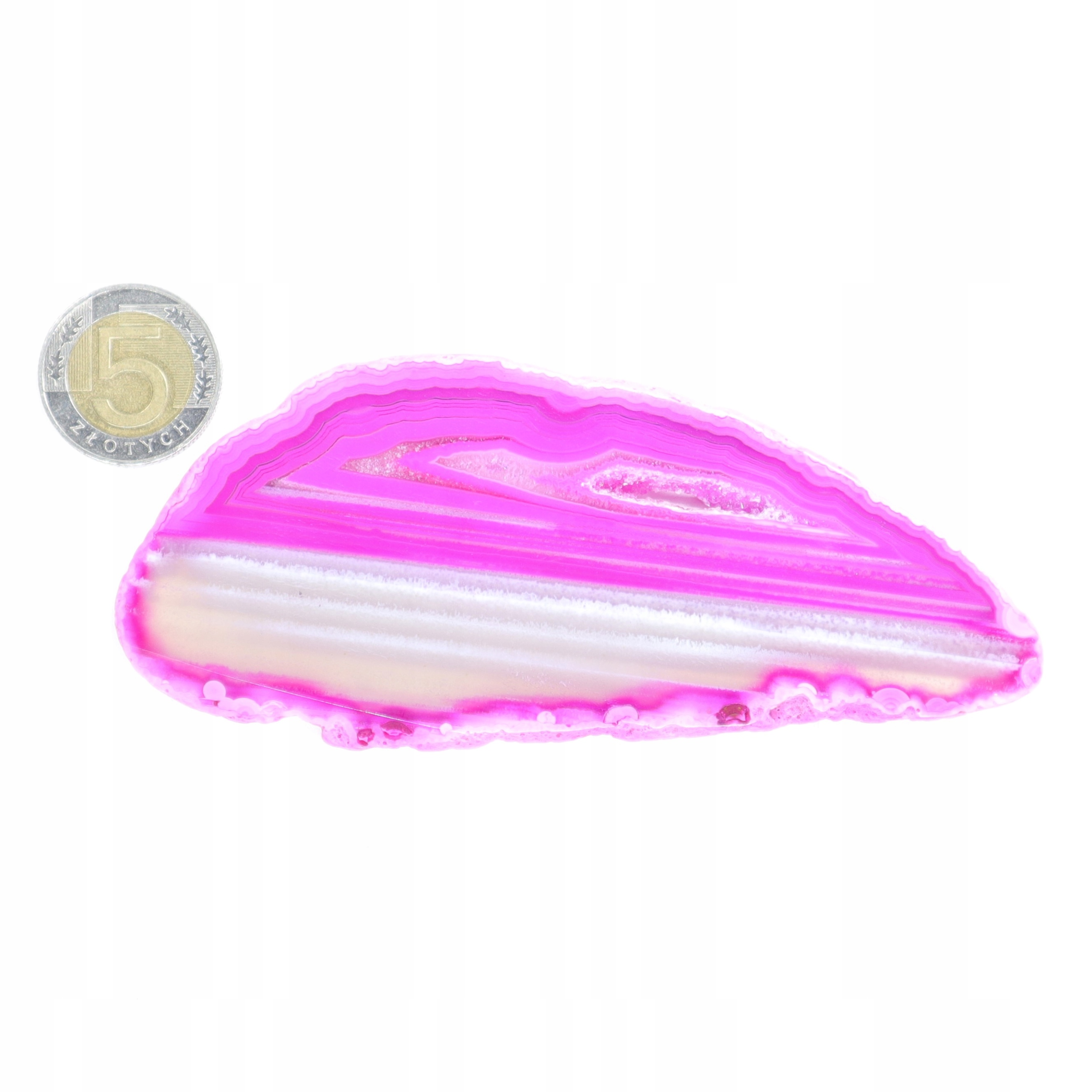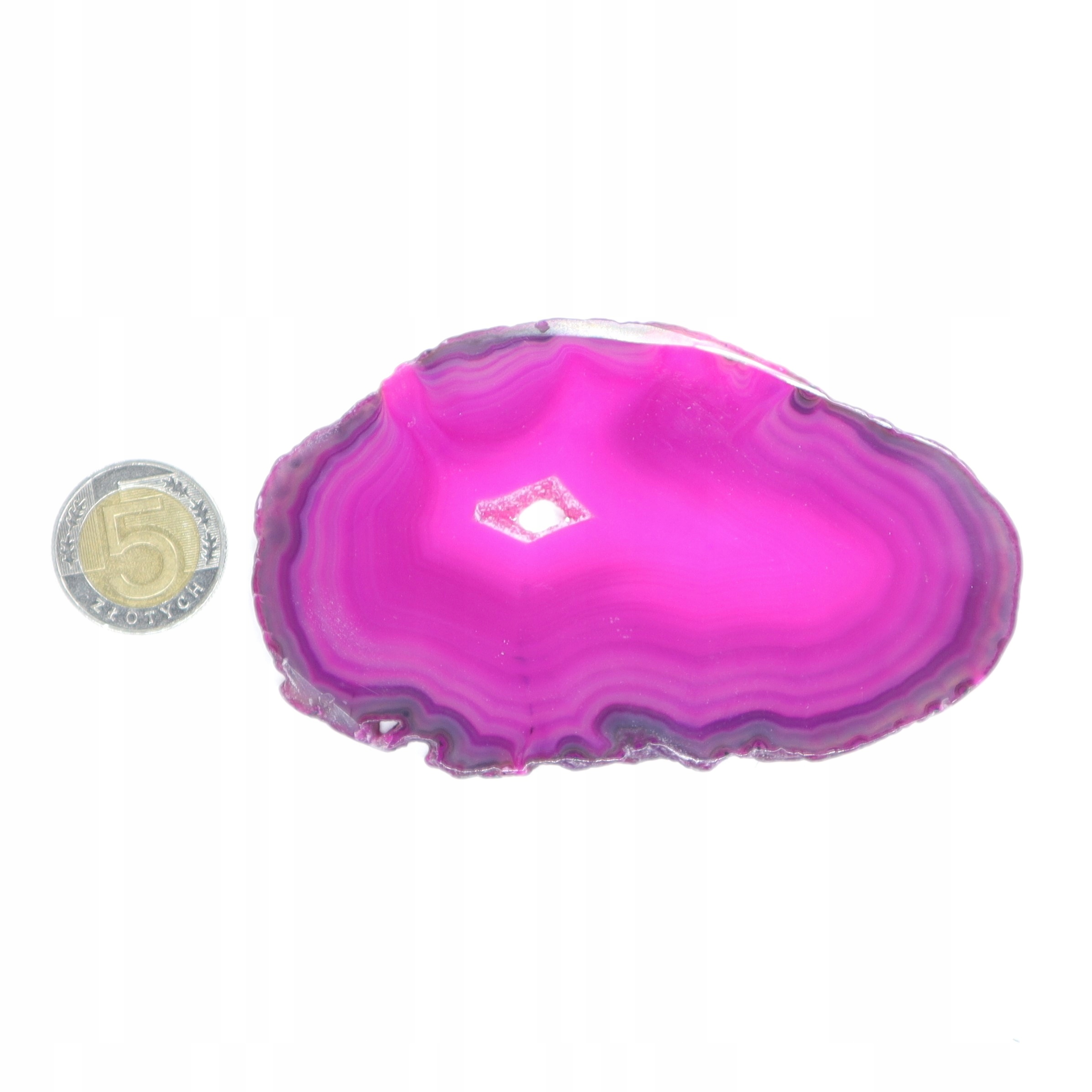 Plastry cięte z naturalnego agatu polerowane barwione na różowo. Plastry różnią się odcieniem, wzorem i rozmiarem.