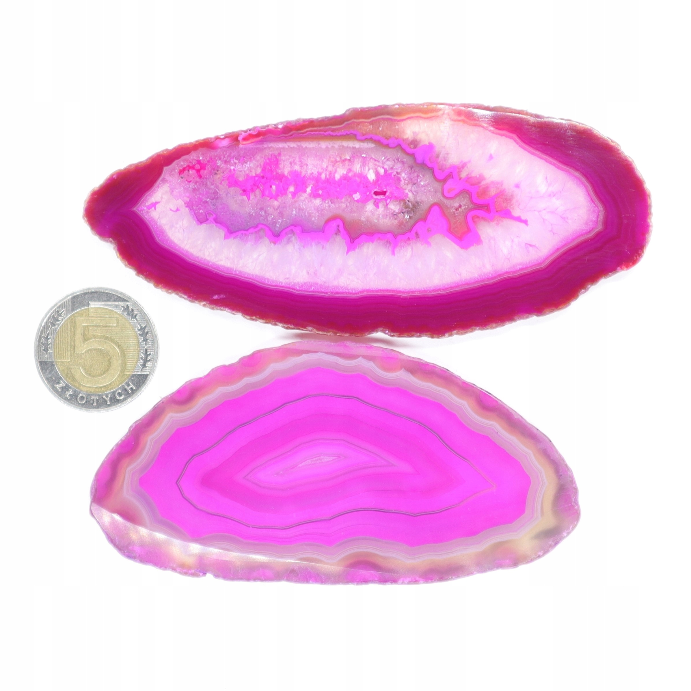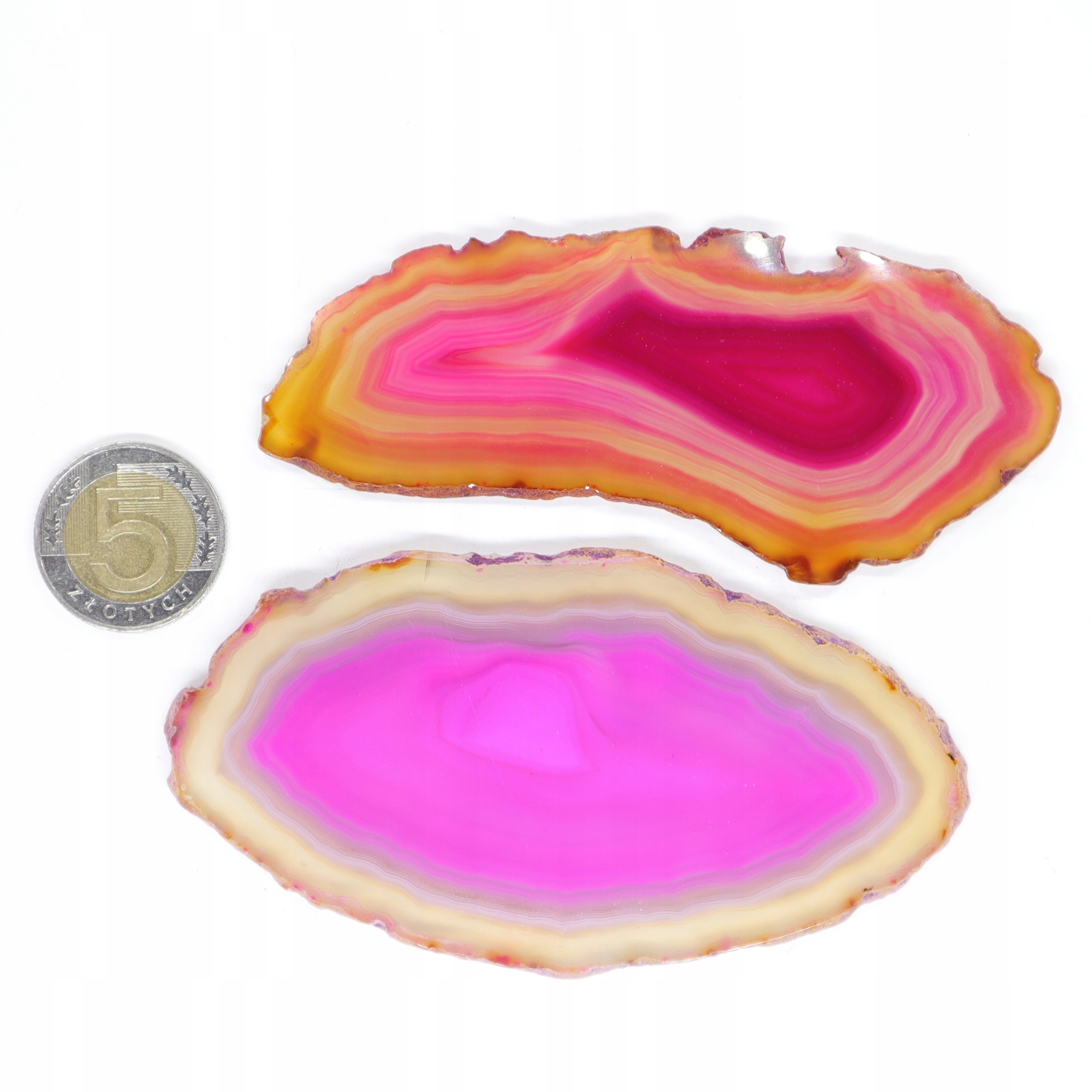 Plastry cięte z naturalnego agatu, polerowane, barwione na różowo. Plastry różnią się odcieniem, wzorem i rozmiarem.