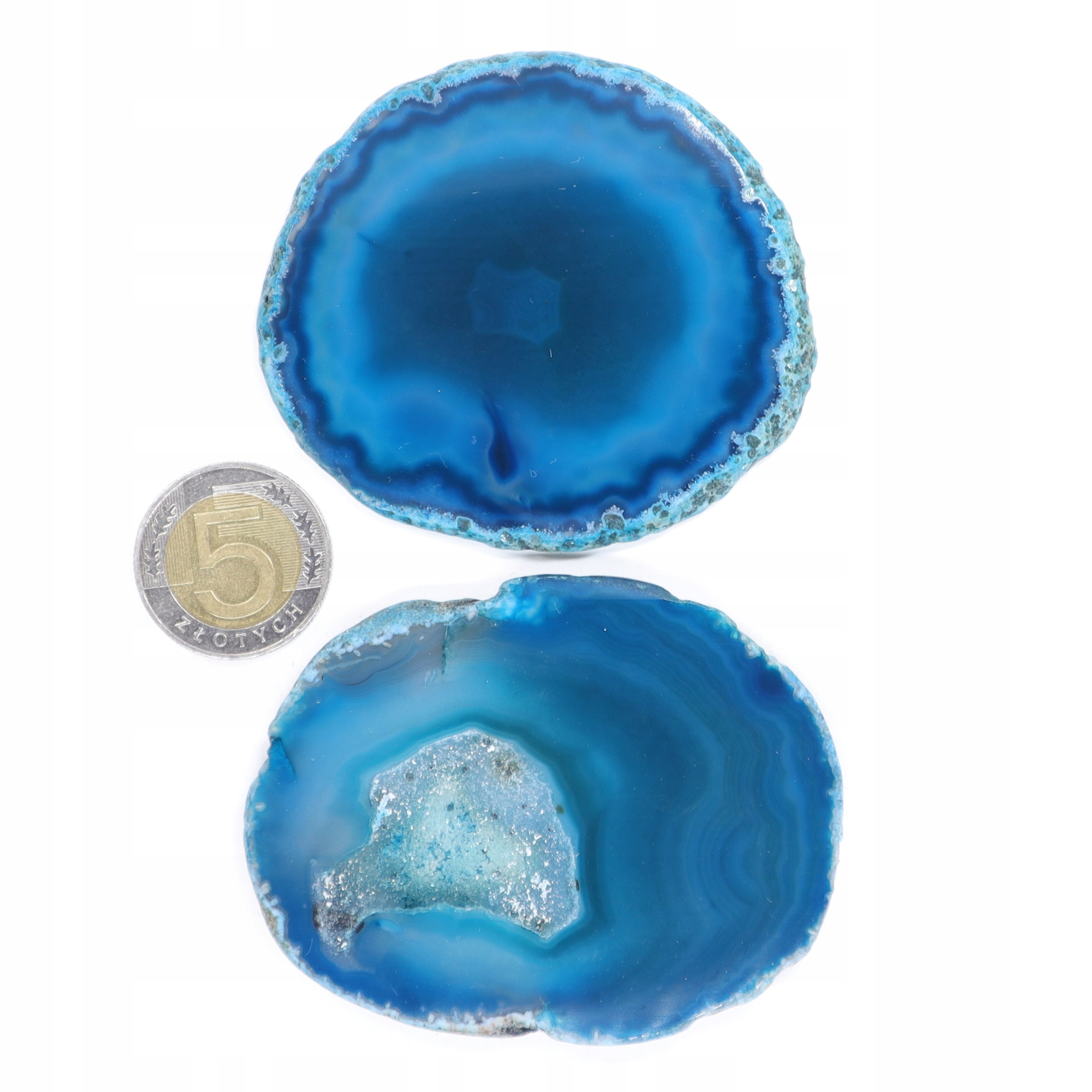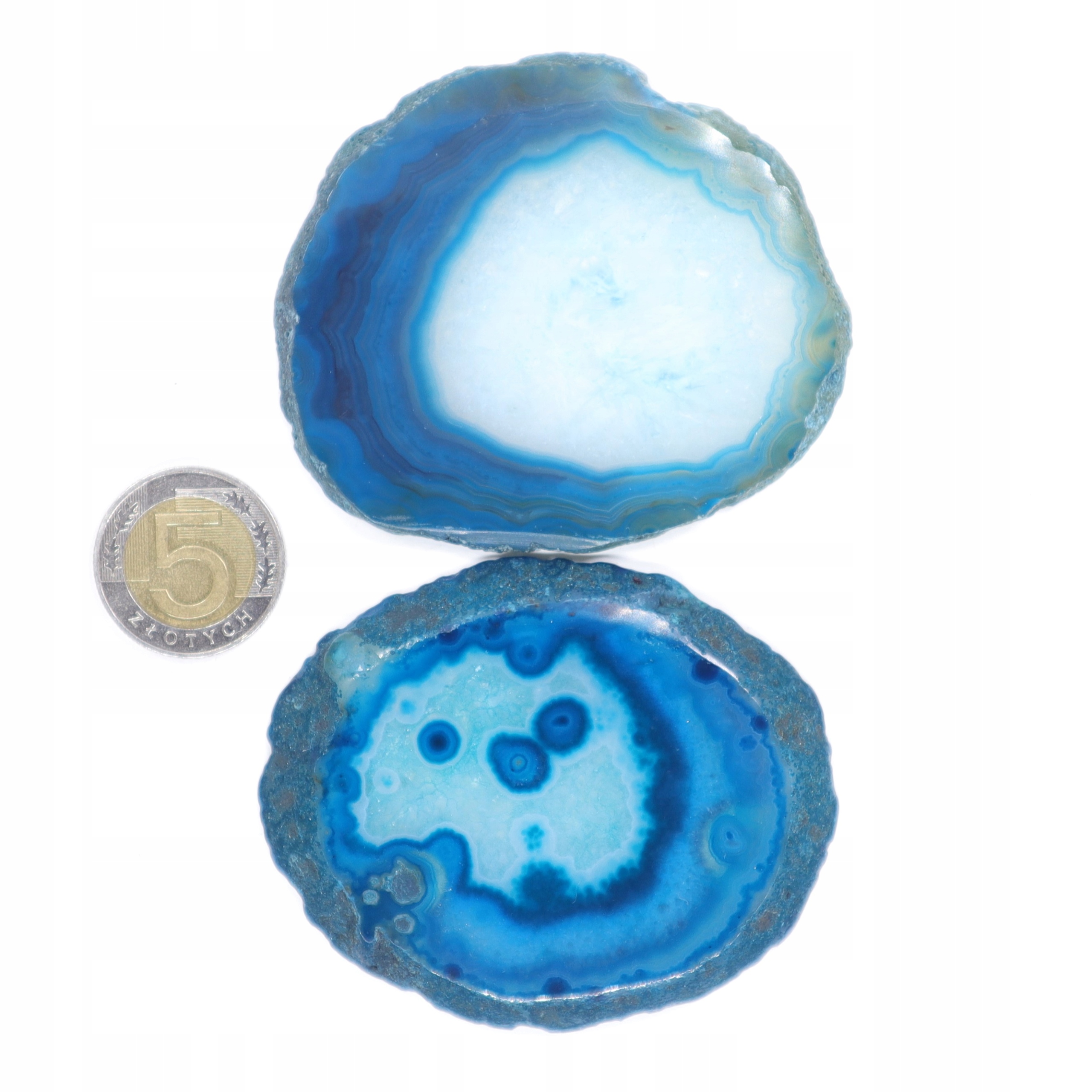 Plastry cięte z naturalnego agatu, polerowane, podbarwiane. Plastry różnią się odcieniem, wzorem i rozmiarem.