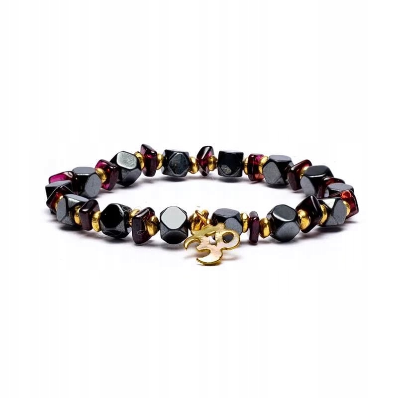 Elastyczna bransoletka z 4mm fasetowanymi koralikami z hematytu oraz granatu. Z przekładkami i symbolem Ohma w kolorze złotym. Zapakowana w woreczek z organzy.