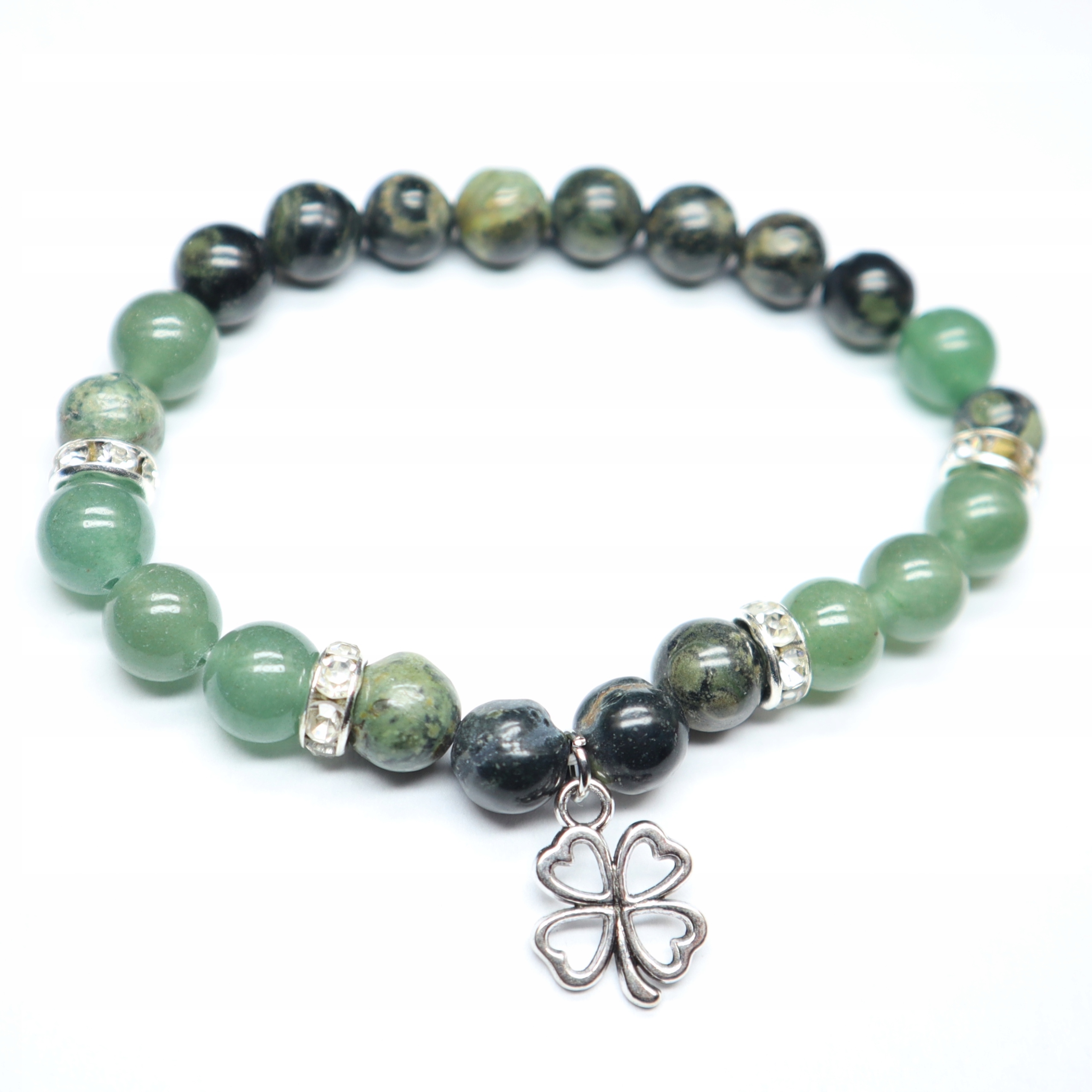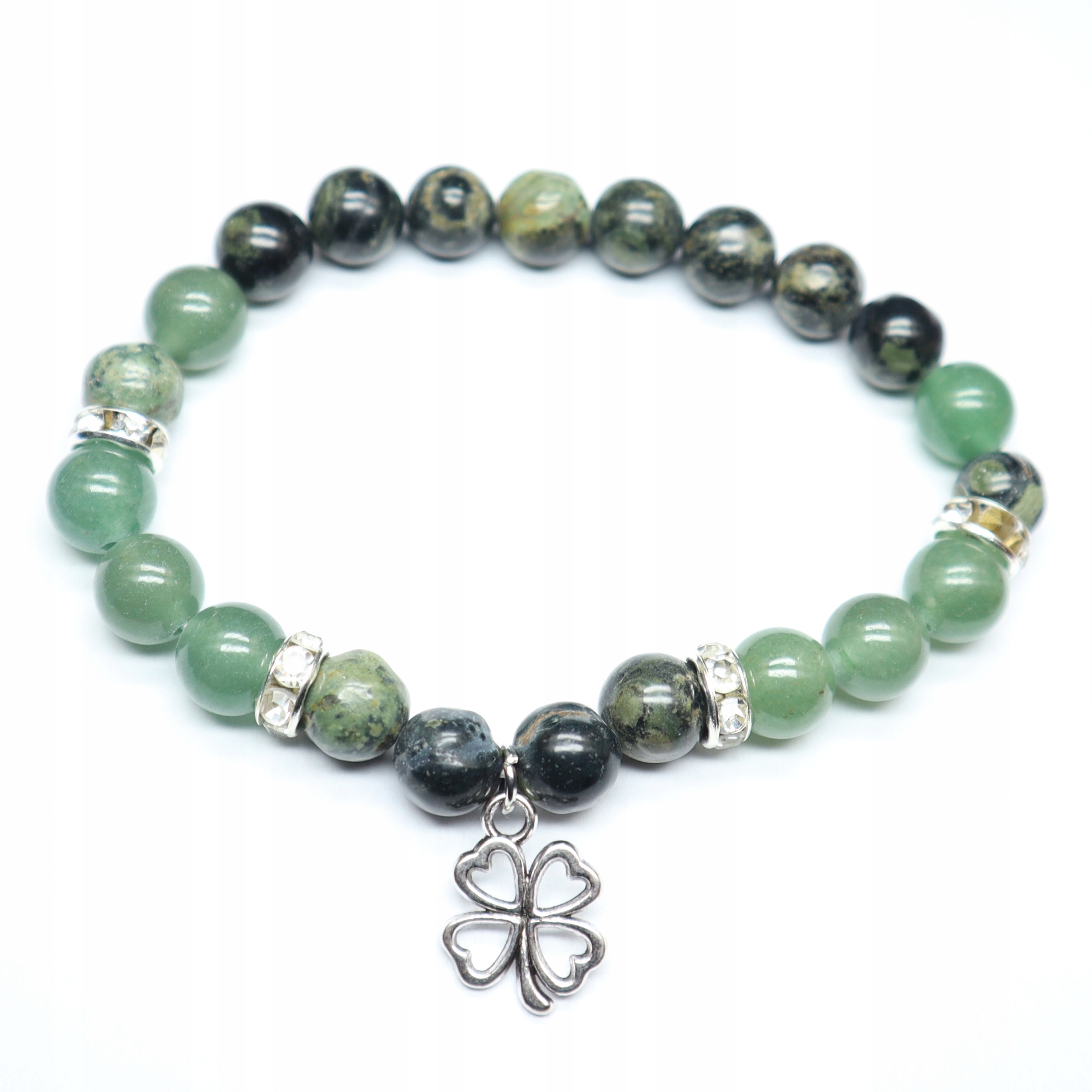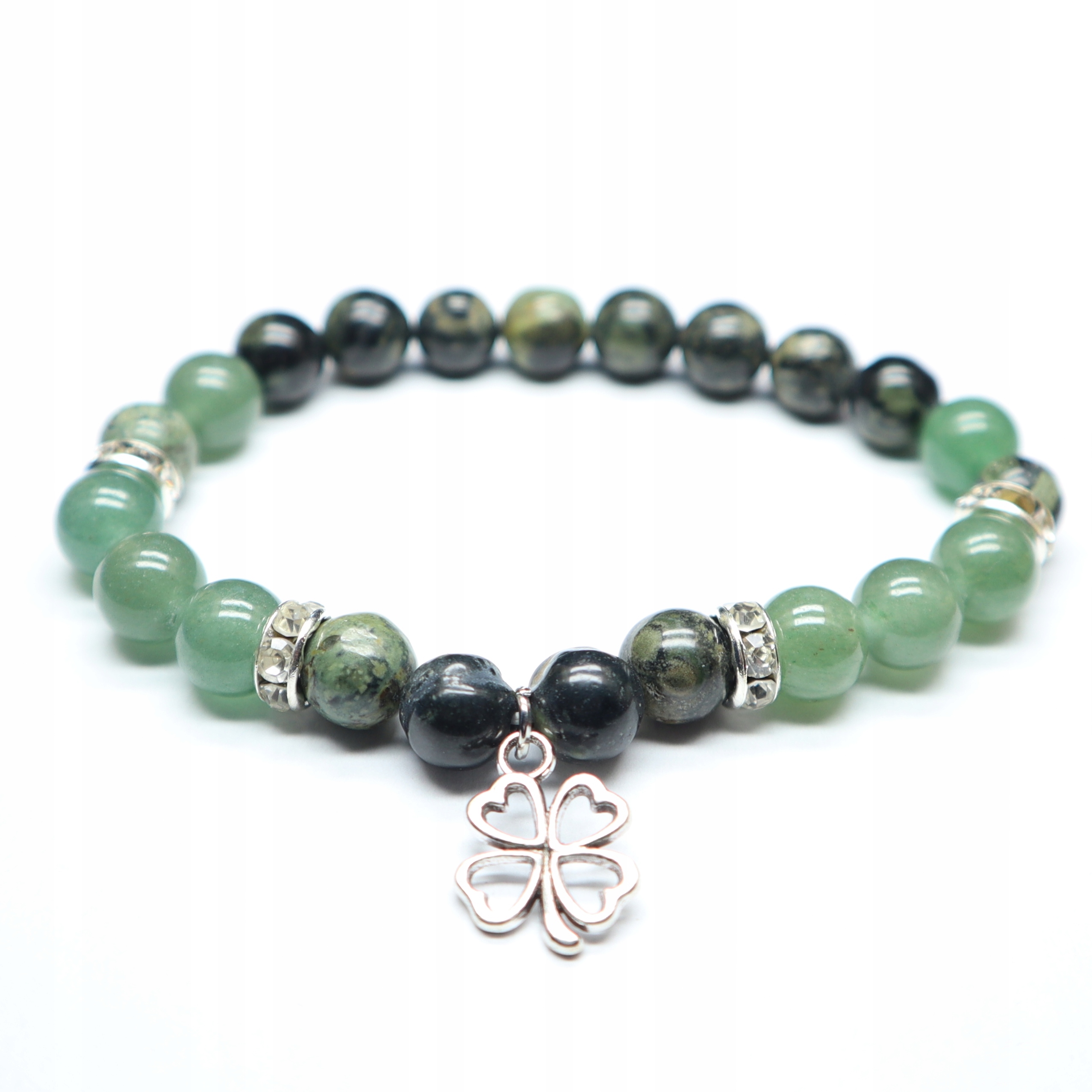 Elastyczna bransoletka z czterolistną koniczyną wykonana z jaspisu kambaba i zielonego awenturynu. Zapakowana w woreczek z organzy.