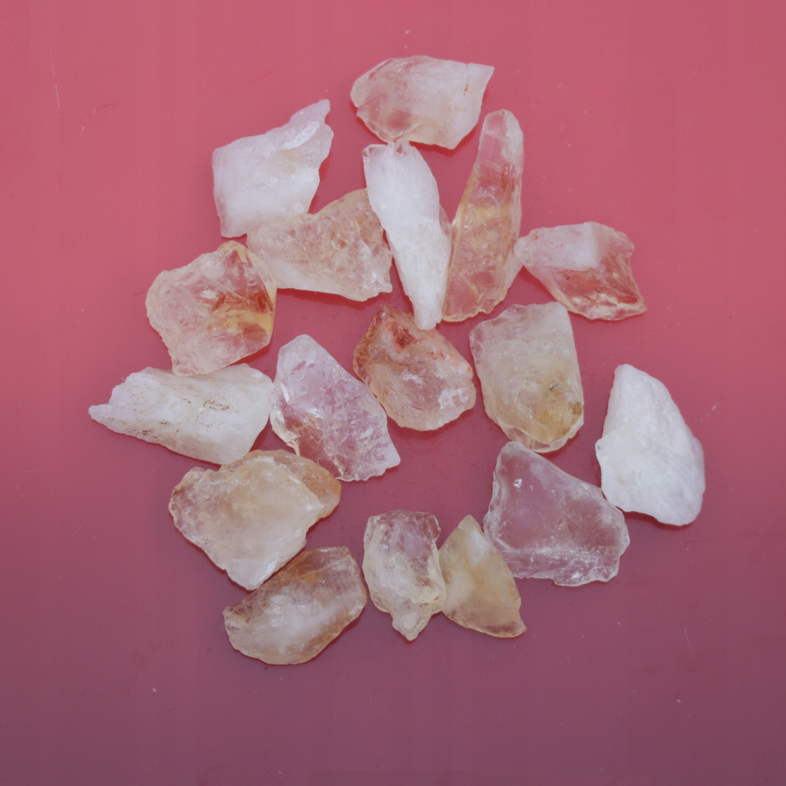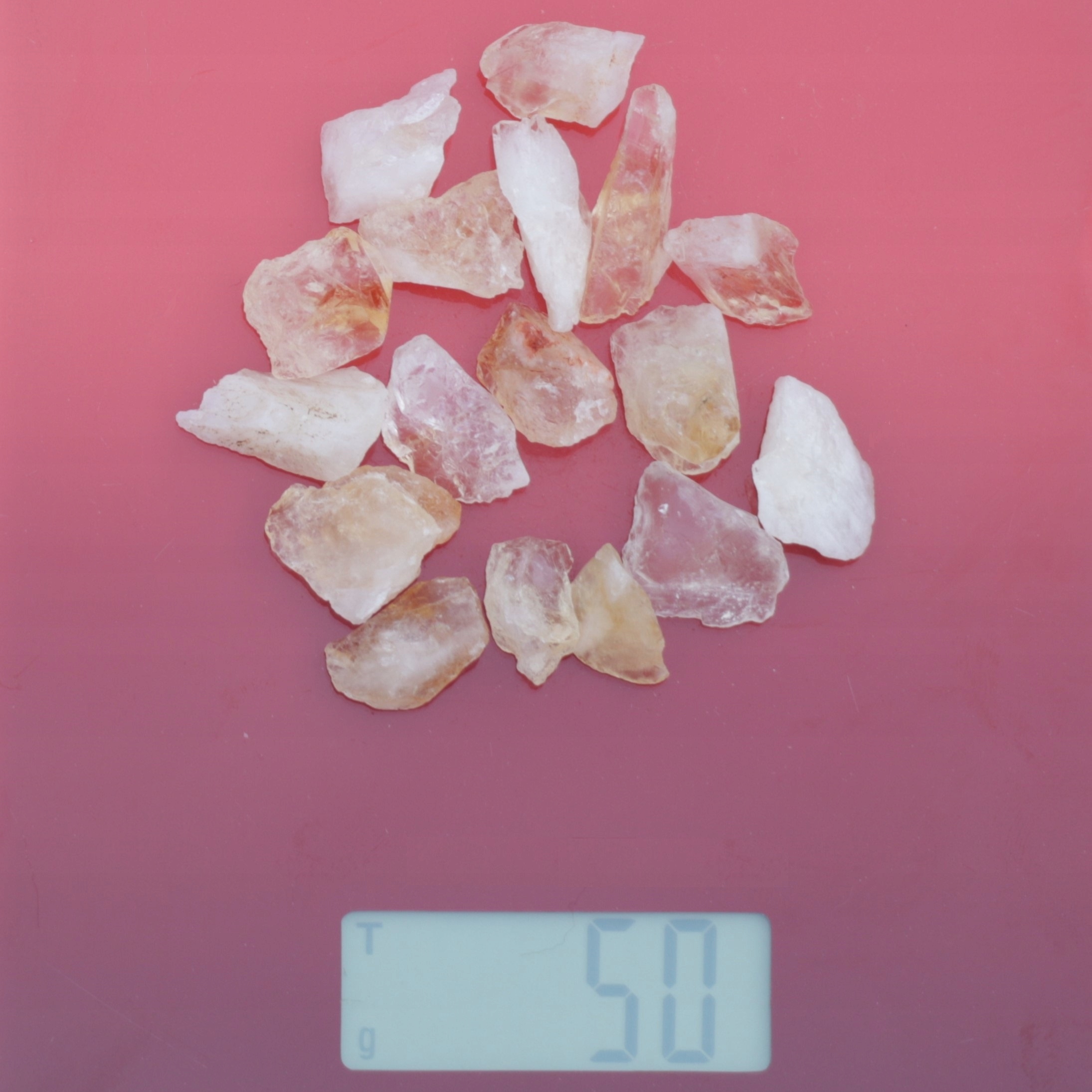Zestaw składa się z drobnych surowych kryształów cytrynu wielkości ok 1-2 cm o wadze całkowitej 50 gram. Ilość w zestawie zależna jest od wagi pojedynczych minerałów. Zdjęcia przedstawia przykładowy zestaw.