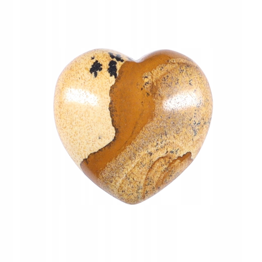 Polerowany naturalny jaspis obrazkowy, pejzażowy w kształcie serca o zmiennej grubości: u góry ok 1,5cm w najgrubszym miejscu 1,8-2,0cm