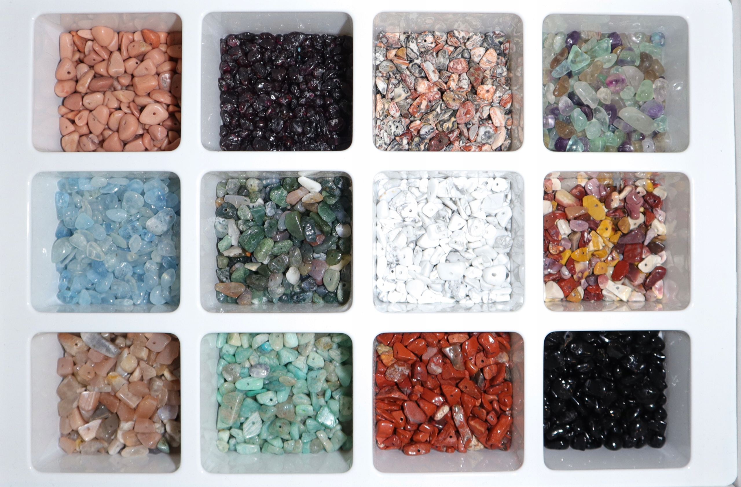 Jaspis czerwony, Akwamaryn AA, Sodalit, Obsydian mahoniowy, Tygrysie oko, Agat czerwony, Lapis lazuli, Turmalin czarny, Awenturyn niebieski, Mookait, Agat indyjski, Kamień księżycowy, Howlit, Obsydian śnieżny, Fluoryt, Kwarc truskawkowy, Labradoryt, Amazonit, Kamień słoneczny, Ametyst, Prehnit.