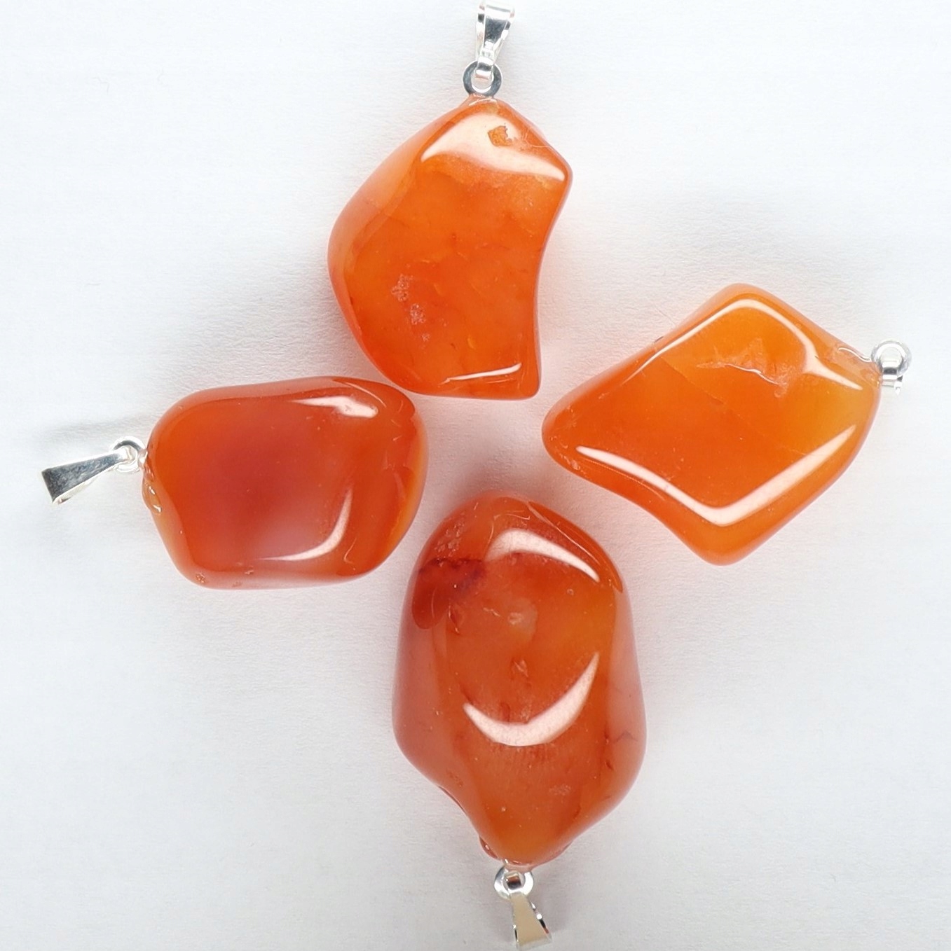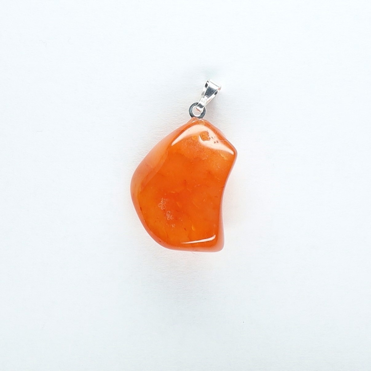 Szlifowana i polerowana kamienna bryłka karneolu rozmiaru S z zawieszką koloru srebrnego.