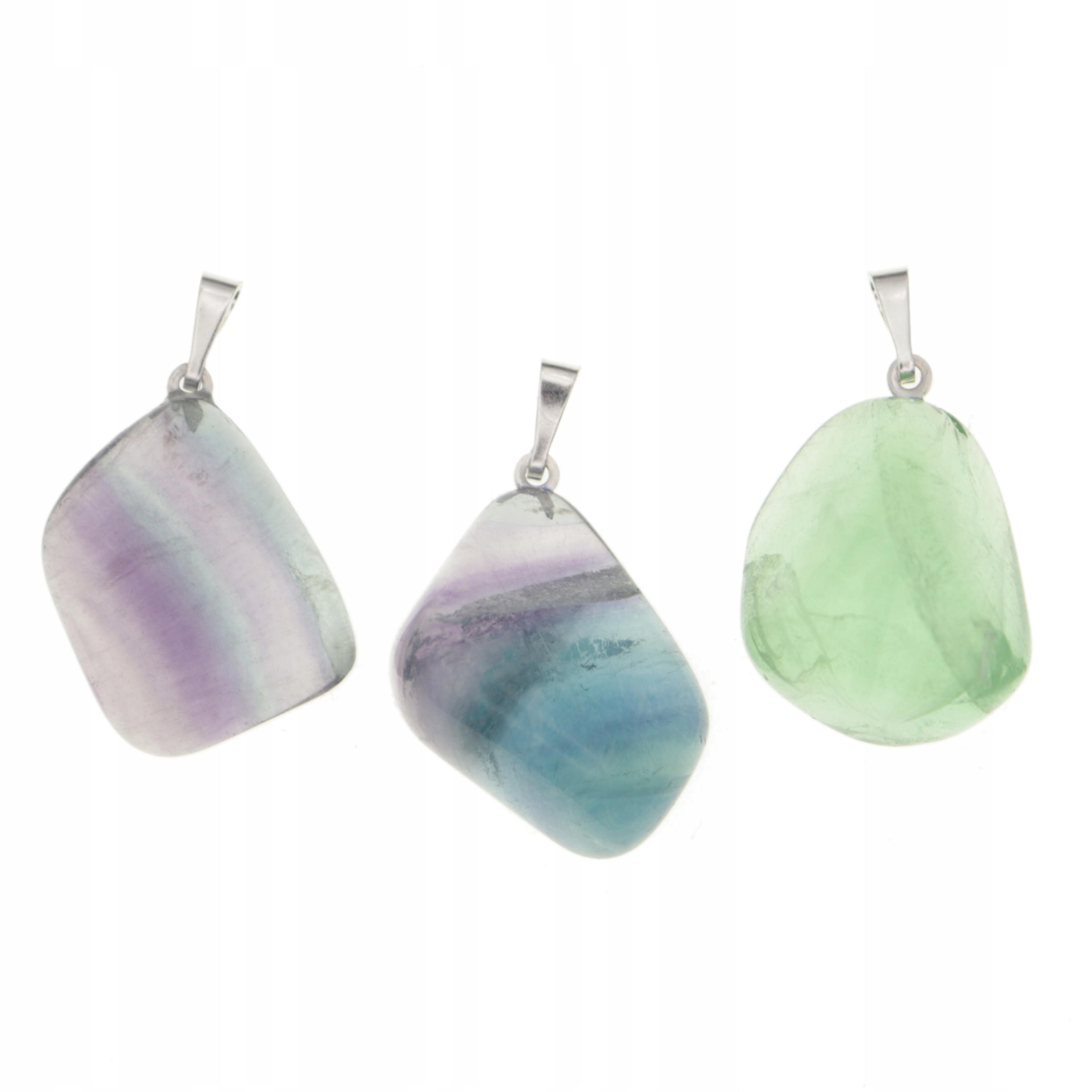Szlifowana i polerowana kamienna bryłka fluorytu z zawieszką koloru srebrnego.