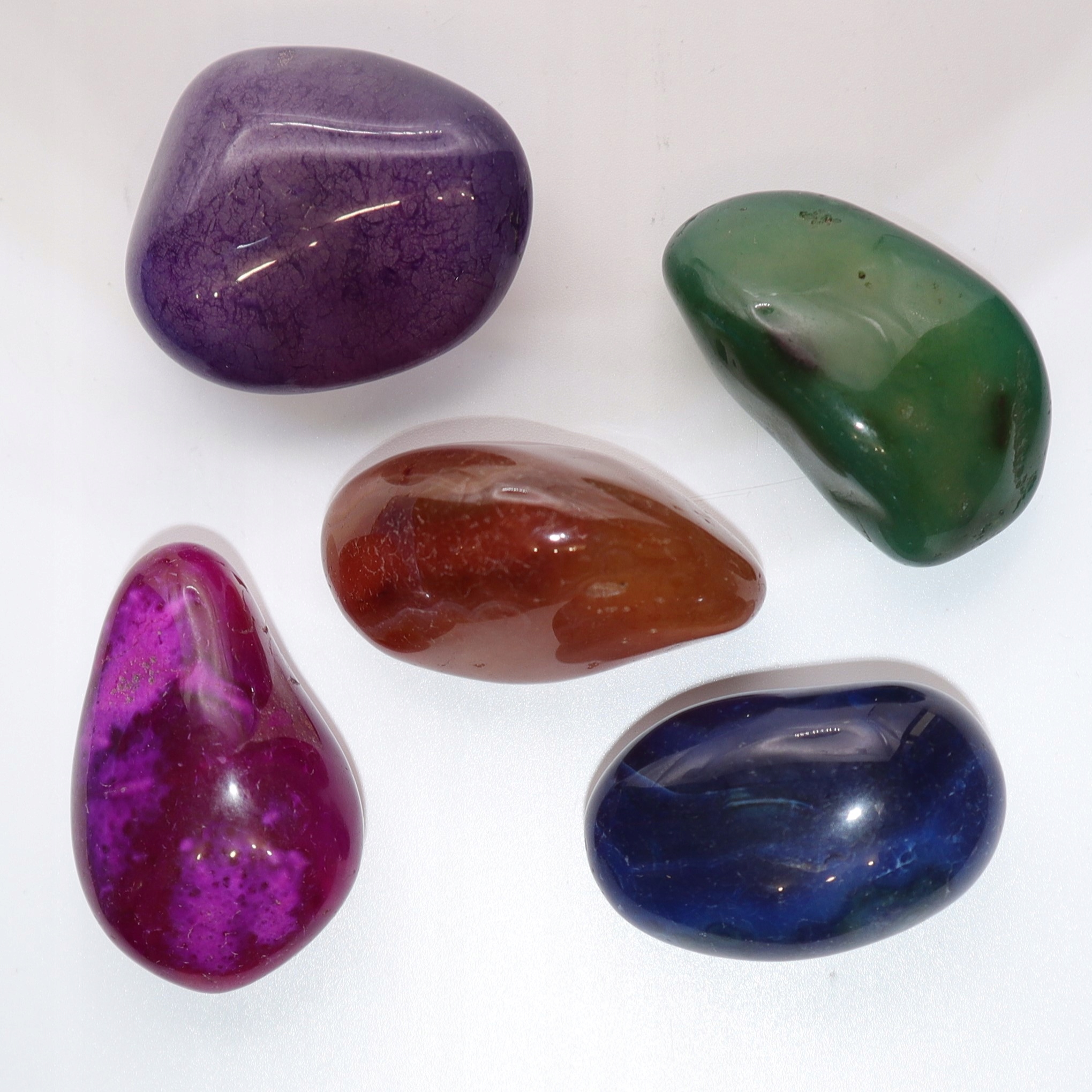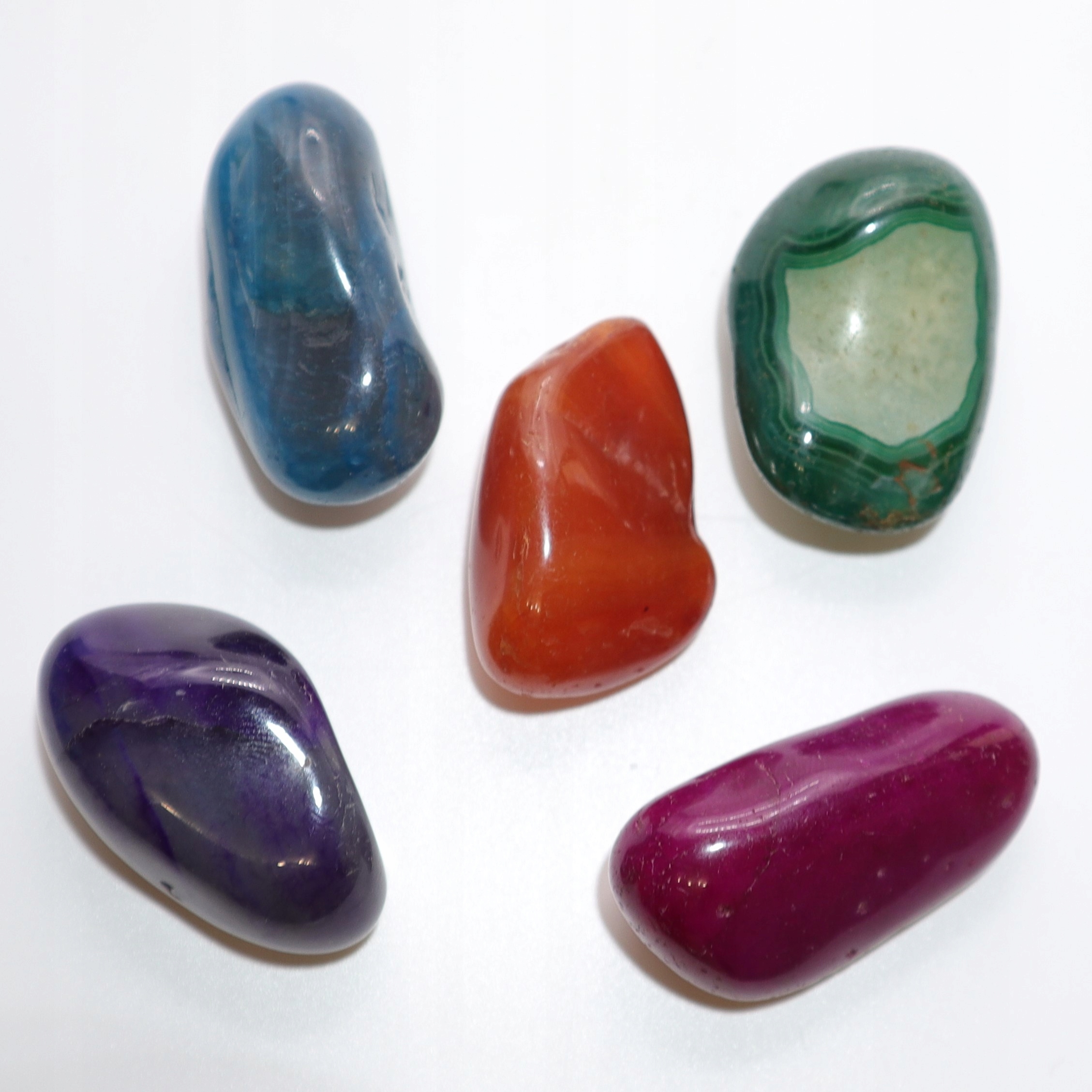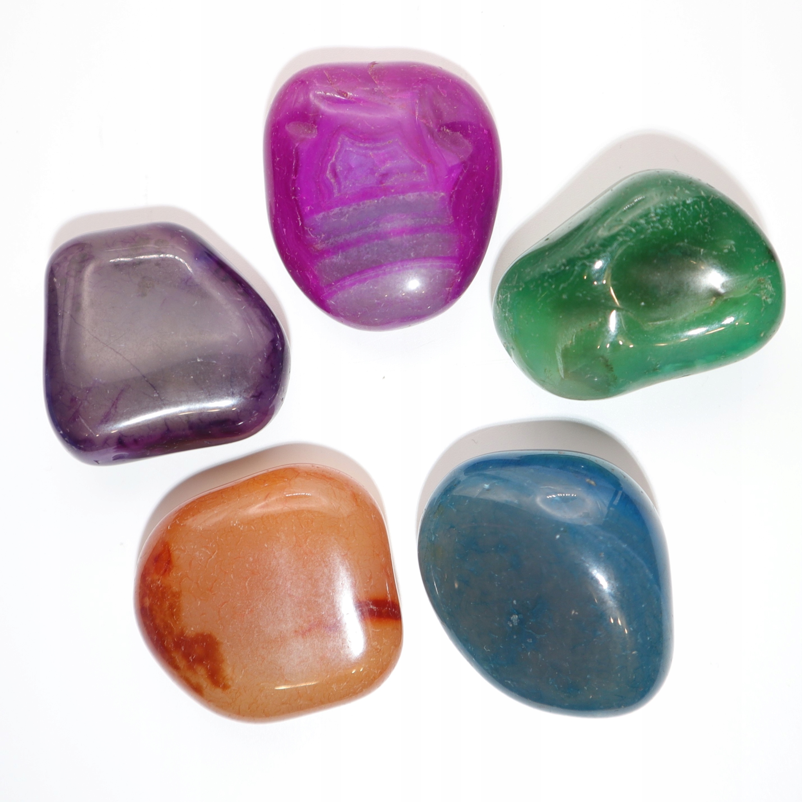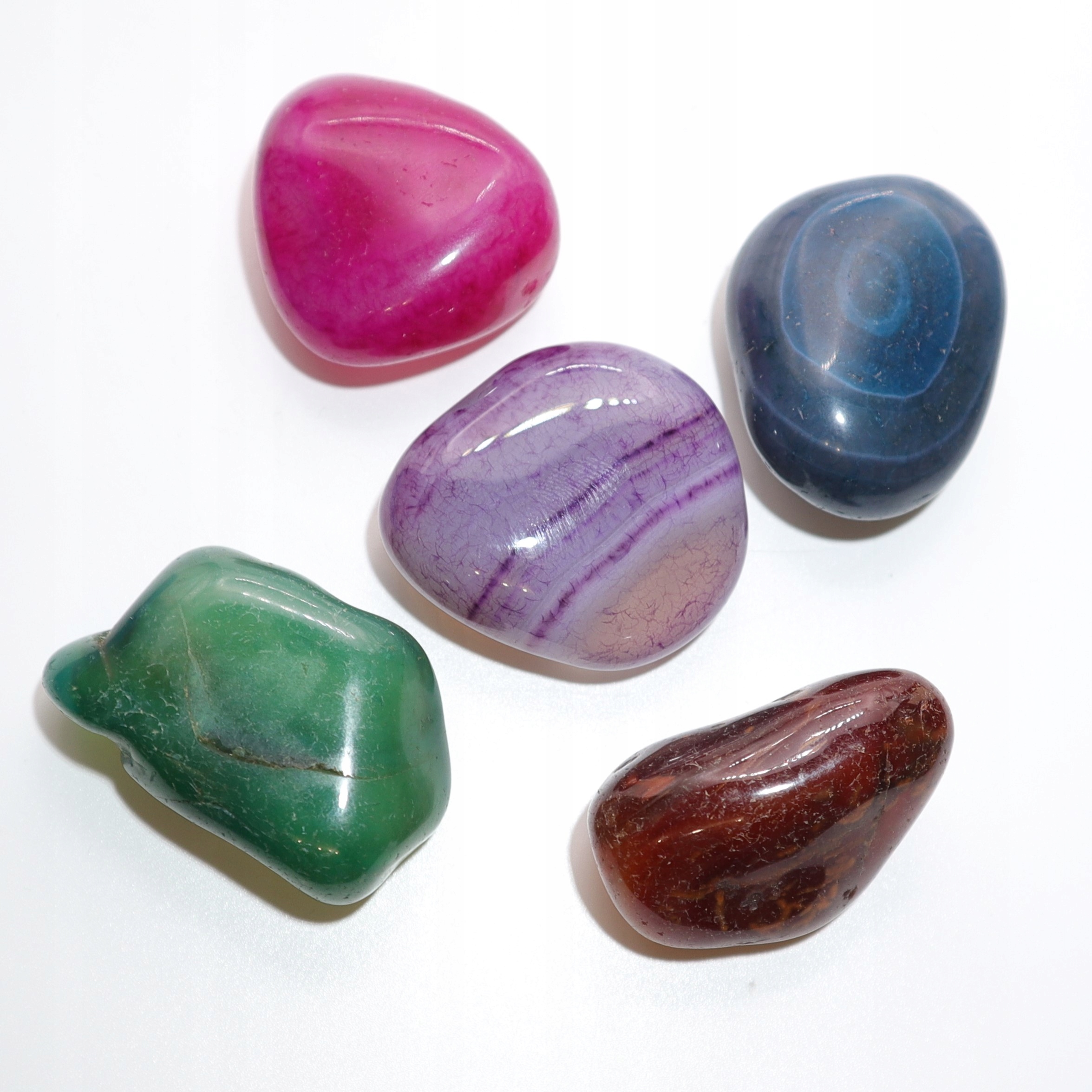 W skład zestawu o wadze minimum 120 gram wchodzi pięć naturalnych, różnokolorowych kamieni agatu rozmiar XL.