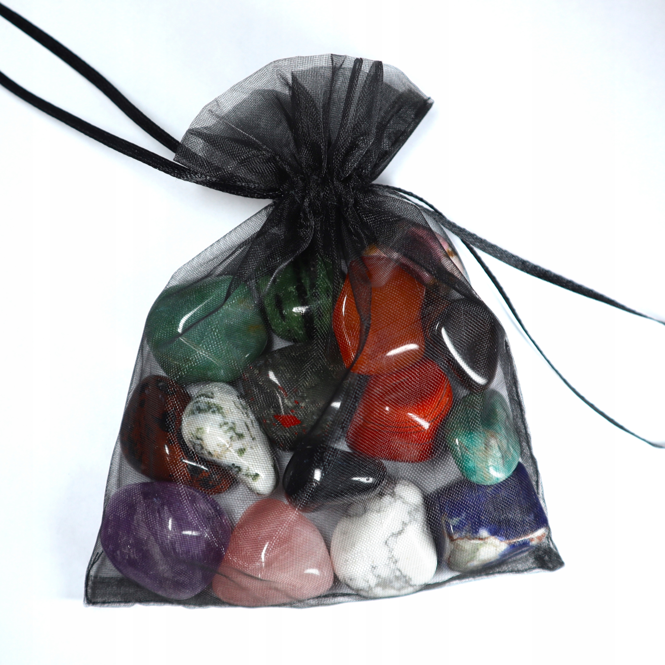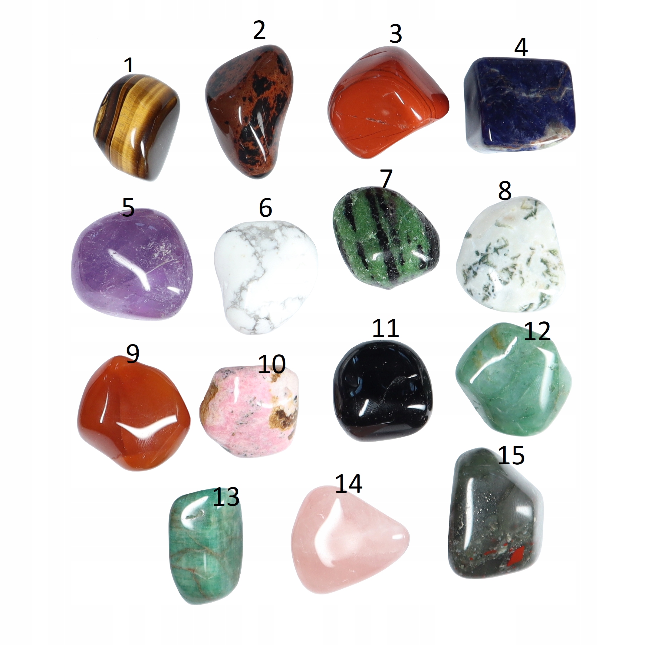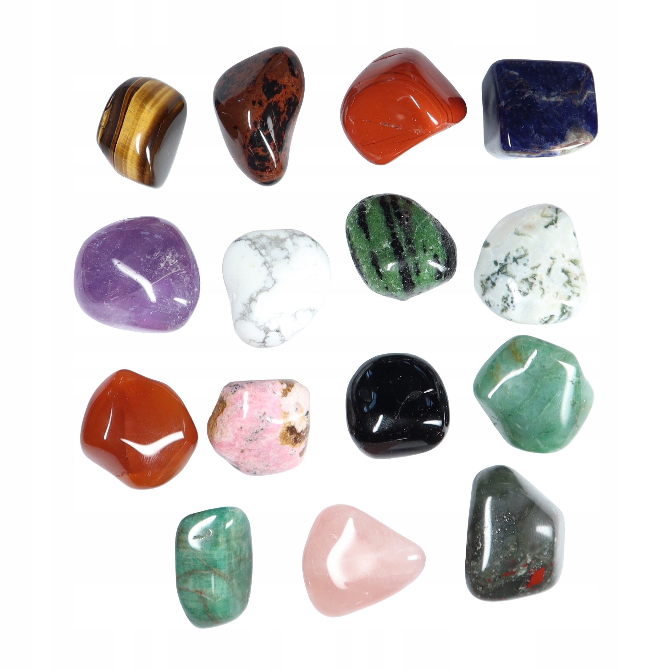 Zdjęcie przedstawia przykładowy zestaw 15 minerałów polerowanych w bębnie szlifierskim.